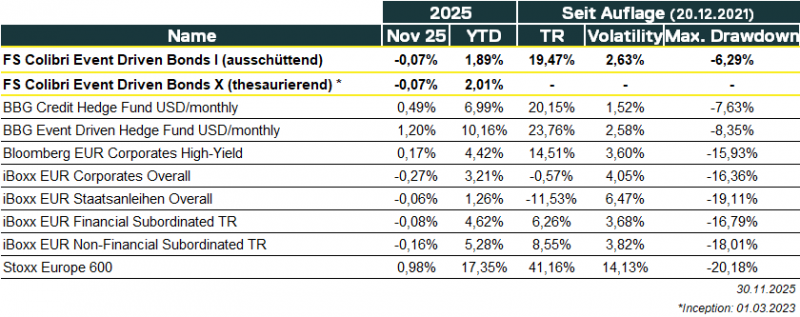 Der Colibri hat im Berichtszeitraum November 2025 eine Wertentwicklung (TR) von -0.07% (DE000A2QND12: I-Tranche – ausschüttend und DE000A3DDTK9: X-Tranche – thesaurierend) erzielt. Das Fondsvolumen zum Ende des Berichtszeitraumes beläuft sich auf 324Mio. EUR.