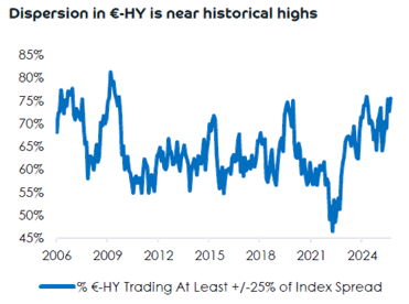 Diese skizzierten und heftigen Ausschläge führen zu einer erhöhten Dispersion. Auch dazu gab es im Vormonat eine spannende Grafik. JP Morgan hat nun nochmals weiter kalibriert. Die folgende Grafik zeigt an, wie viel Prozent des EUR HY-Marktes sich 25% oder mehr vom Index nach oben oder unten wegbewegen. Die Oberfläche scheint ruhig, darunter gibt es jedoch extrem ein beide Richtungen und das gesunde Mittel scheint zu fehlen.