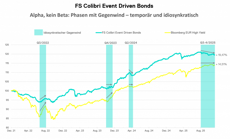 Typischerweise treten sie auf, wenn der Fonds Gegenwind erfährt, leicht abgibt oder sich seitwärts bewegt, während der Markt seine All-In-Yield verdient. So auch jüngst geschehen. Der Chart zeigt diese Phasen in Q2/2023, Q4/2023, Q2/2024 und auch die aktuelle Phase. Damals wurden Verluste realisiert oder an Positionen festgehalten. Temporärer Gegenwind, während die Investment- also die Eventthese intakt ist, bleibt auszuhalten. Neu ist das Auftreten in zwei aufeinanderfolgenden Quartalen.