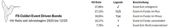 Folgend haben wir eine Übersicht der „Event Hit-Ratios“ für 2025 dargestellt. Die sog. Basis-Trades im Liquidität-Portfolio (Ø ca. 15% Allokation) sind hier nicht berücksichtigt. In der Übersicht wurden alle Sondersituationen und deren Status Quo abgetragen. Welche Situationen haben funktioniert, welche sind noch im Fonds, liegen vorne, hinten oder sind unverändert bzw. wo mussten Verluste realisiert werden. Erkennbar wird, dass knapp ein Viertel aller Sondersituationen in 2025 bisher keinen positiven Kontributionsbeitrag leisten konnten. Ca. 17 Prozentpunkte dieser 25% sind jedoch weiterhin bewusst im Colibri allokiert. Sollten Sie einen tieferen Einblick in die gesamte Übersicht wünschen kontaktieren Sie gerne Mona Zelle (mz@fountain-square.com) oder kommen auf mich zu. Wir freuen uns da über jeden Austausch.