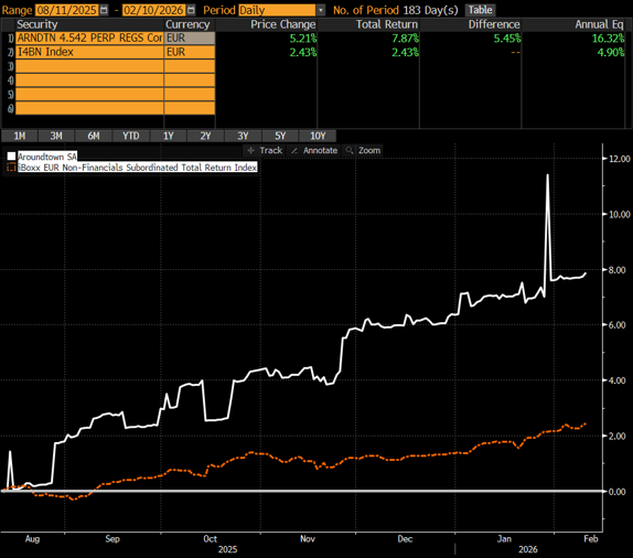 - airBaltic – Wir lesen lettisch: Im Berichtszeitraum gab es weitere News um die lettische Staatsairline (Lettischer Staat = A- Rating). Ein IPO war lange das Ziel, durch den Cash-Burn in 2025, fehlerhafte Motoren und vor allem die Suche nach einem neuen CEO (s. Briefing im Dezember), musste dieser verschoben werden. Frisches Geld braucht der Konzern mit der jüngsten Flotte Europas trotz dessen zur Überbrückung. Es kam daher ins Spiel, ob neben Lufthansa, die erst in H2/2025 10% an airBaltic erworben haben, ein weiterer Investor dazu genommen wird. Das hat bei diesem, durchaus volatilen Bond, nochmals für Unruhe gesorgt und das Papier um 4-5 big figures nach unten genommen. Die Kernthese ist und bleibt jedoch, dass die Fluggesellschaft als kritische Infrastruktur im Baltikum zu relevant ist, um diese nicht weiter zu stützen. Die Ministerpräsidentin Lettlands hat so etwas vor kurzem erst bestätigt: https://statics.teams.cdn.office.net/evergreen-assets/safelinks/2/atp-safelinks.html