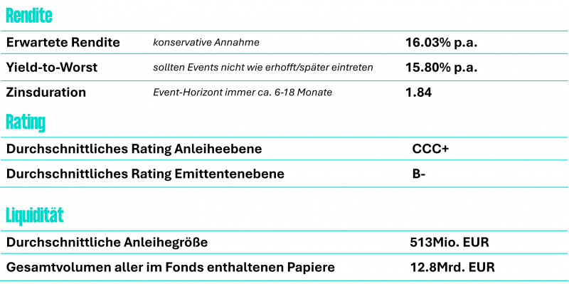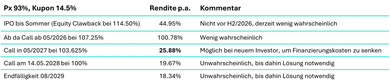 - Ohla – Out-of-scope (noch): Das spanische Bauunternehmen gehört zu den größten Positionen im Fonds. Gerade konnte man einen neuen Auftrag im Photovoltaik-Bereich gewinnen (auch das passiert) und eine Lösung für ein großes Einkaufszentrum finden. Dieses teilte man sich mit einem Investor, die Struktur machte die Finanzierung (auf das Asset, nicht auf Ebene des Emittenten) und den Verkauf schwierig. Für die Neuaufteilung wurde im Berichtszeitraum eine Lösung gefunden, was die weiteren Schritte nun ermöglicht. Im regelmäßigen Austausch konnte im Zuge all der positiven Nachrichten ermittelt werden, dass der Emittent eine Refinanzierung seiner (zu teuren) Anleihe plant. Das 335Mio. EUR große Papier stammt aus einer Restrukturierung (damals Schublade „ReOrg“), die wir schon aktiv mitbegleitet haben. Die Recovery (heutige Schublade) schreitet erfolgreich voran, wie die zuvor genannten Aspekte aufzeigen. Ab August 2026 ist die besicherte und einzige Anleihe der simplen Kapitalstruktur zu 100% kündbar. Der Kupon beträgt teure 9.75%. Da das Papier aktuell nur bei 93/94 notiert, ergeben sich Aufwärtspotentiale von 6-7 big figures, während man noch ein halbes Jahr den Kupon von 9.75% vereinnahmt à Rendite p.a. auf den Call 3% p.a.Ein großes Problem, welches wir jüngst auf den Emittenten zugetragen haben, ist, dass im Bloomberg-System keinerlei Renditen gerechnet werden können. Dies liegt daran, dass die Anleihe den Kupon sowohl in Cash als auch in Form neuer Anleihen (PIK) zahlt. Bei vergleichbaren Papieren kann dies berechnet werden, Bloomberg hat sich dem bisher leider nicht angenommen, der Emittent davon noch nichts gewusst. Diesen Informationstransfer haben wir jüngst vorgenommen, um eine Änderung zu erzielen. Das Problem dahinter ist vor allem, dass die eigentlich attraktive Anleihe vollkommen unter dem Radar läuft. Investoren werden in regelmäßigen Screenings nicht darauf aufmerksam, da diese keine brauchbaren Daten anzeigt. Aktives Screening hat sich hier gelohnt, nun gilt es jedoch auch die restliche Fleißarbeit bis zur Refinanzierung erfolgreich zu erbringen. Es ist selbstverständlich bedauerlich, dass weder der Emittent noch Bloomberg diesen Sprung allein meistern, aber auch darin können eben Opportunitäten versteckt liegen.