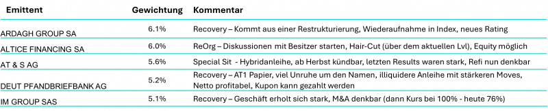 Das ist nur ein Auszug möglicher Mechanismen. Im Fokus steht, dass man achtsam an der Waterkant ist. Im Berichtszeitraum waren wir daher u.a. erneut in London, um den Austausch zu anderen Credit-Investoren und vor allem auch zu den sog. „Legal und Financial Advisorn“ zu suchen, die solche Transaktionen betreuen. Im Prozess etablierte regelmäßige Abgleiche der Watchlist erlauben frühzeitig zu erahnen, wo solche, und das möchten wir auch in aller Deutlichkeit sagen, ethisch sicherlich bedenkliche Transaktionen, auftauchen könnten. So kann man frühzeitig bereits im Analyse Prozess Abstand nehmen. Es geht also immer um das Management von Downside-Risiken vor und während einer Investition.