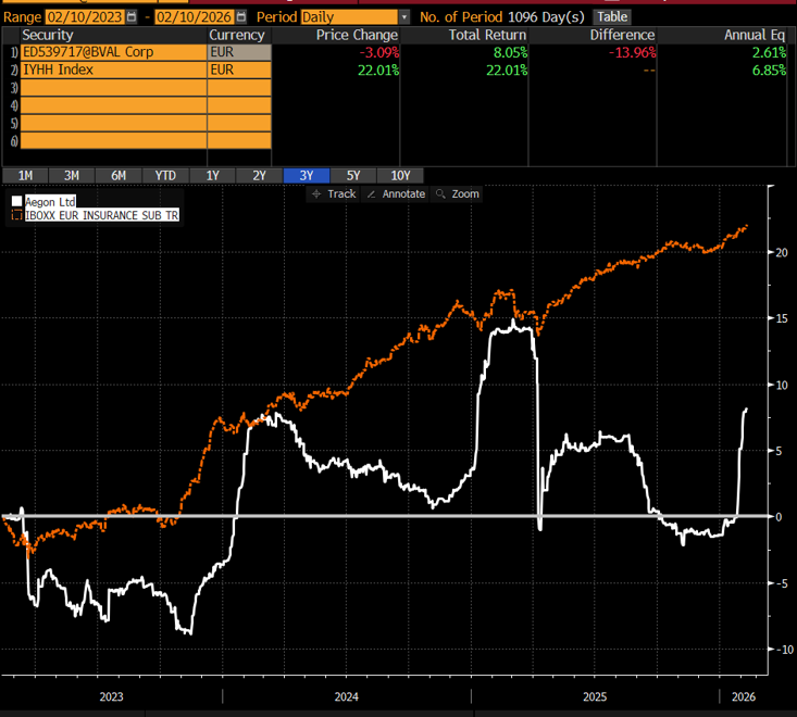 Aktuell kam, ohne jegliche News durch den Emittenten selbst, Bewegung in die Anleihe. Die Positionsgröße wurde wie zuvor skizziert adjustiert. Ein weiterer Versicherungskonzern, CNP aus Frankreich, hat eine ihrer Anleihen mit gleichem Zuschnitt bei 100% vom Markt genommen. Das Aegon Papier hingegen notiert noch deutlich unter 100%, weil der Emittent beschlossen hat nach dem Verkauf des niederländischen Geschäfts, seinen rechtlichen Sitz in die USA zu verlagern. Nun schauen viele gespannt darauf, ob der Einfluss des neuen versicherungsrechtlichen Frameworks einen Einfluss auf den Emittenten hat oder nicht. Der Emittent selbst hält sich höflich bedeckt. Ein Rückkaufangebot (sog. Tender) erscheint wahrscheinlicher als eine direkte Kündigung. Es geht also ausschließlich um die Optionalität einer Kapitalmaßnahme. Andere Emittenten haben vorgelegt, Aegon könnte, wenn auch opportunistisch, folgen. Die derzeitigen Rendite-Risiko Profile erscheinen weiterhin spannend.